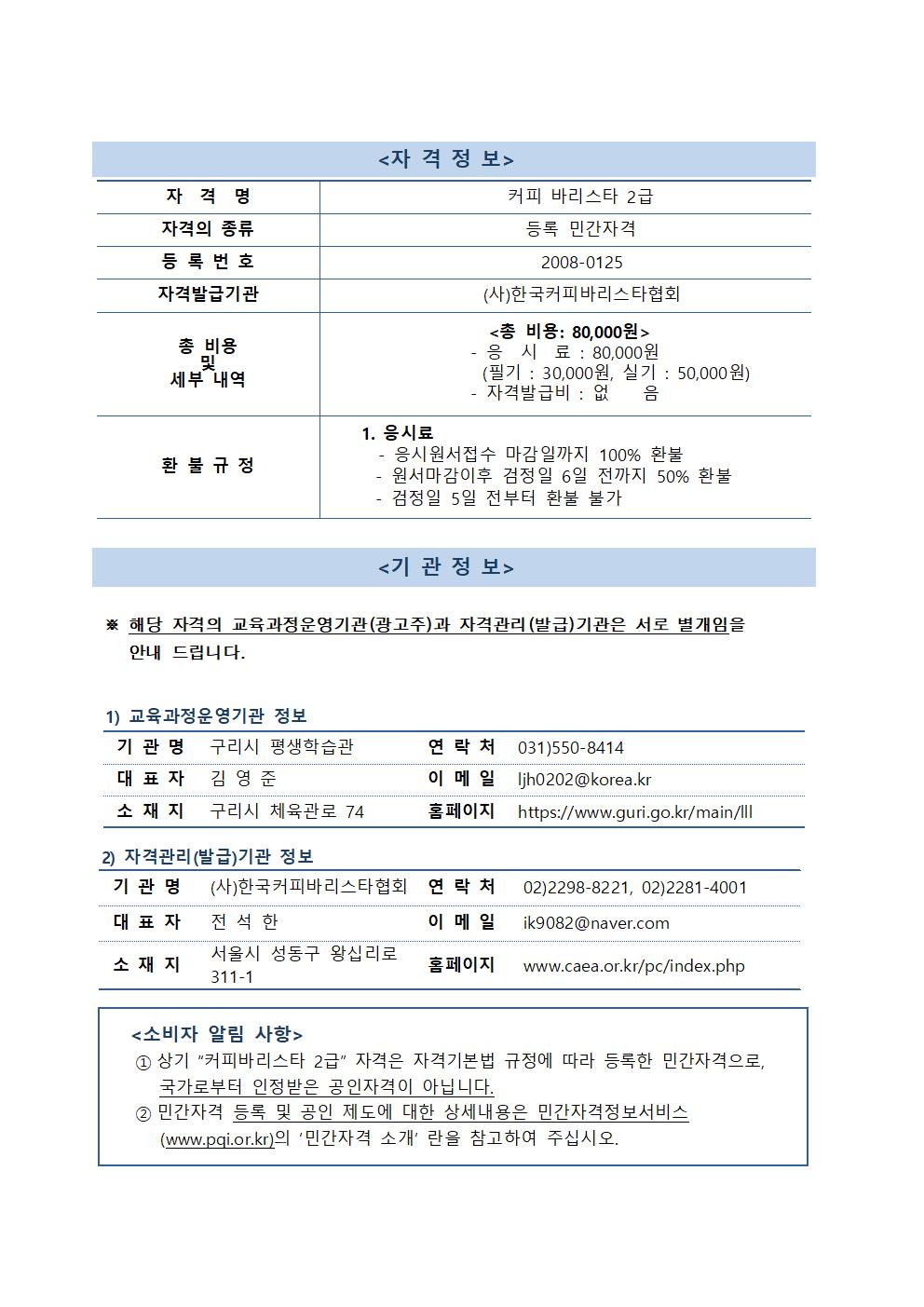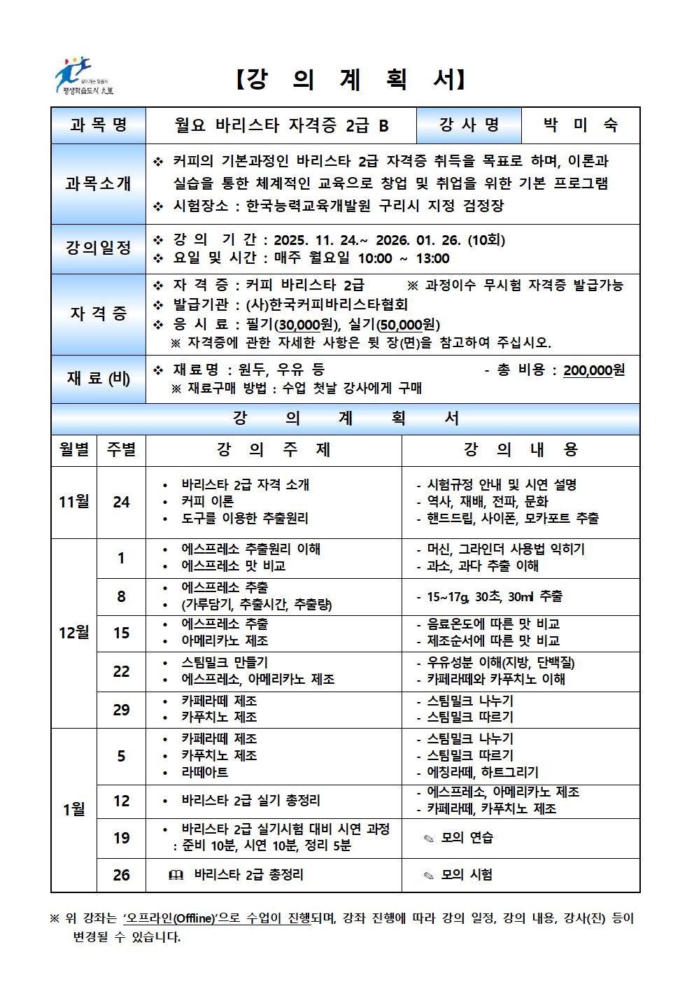 [구리시평생학습관] [구리시평생학습관]2025년 하반기 정규강좌 04. (외부)월요 바리스타 자격증 2급 B프로그램 별 일정 및 강의 계획서 사전 확인 필수!