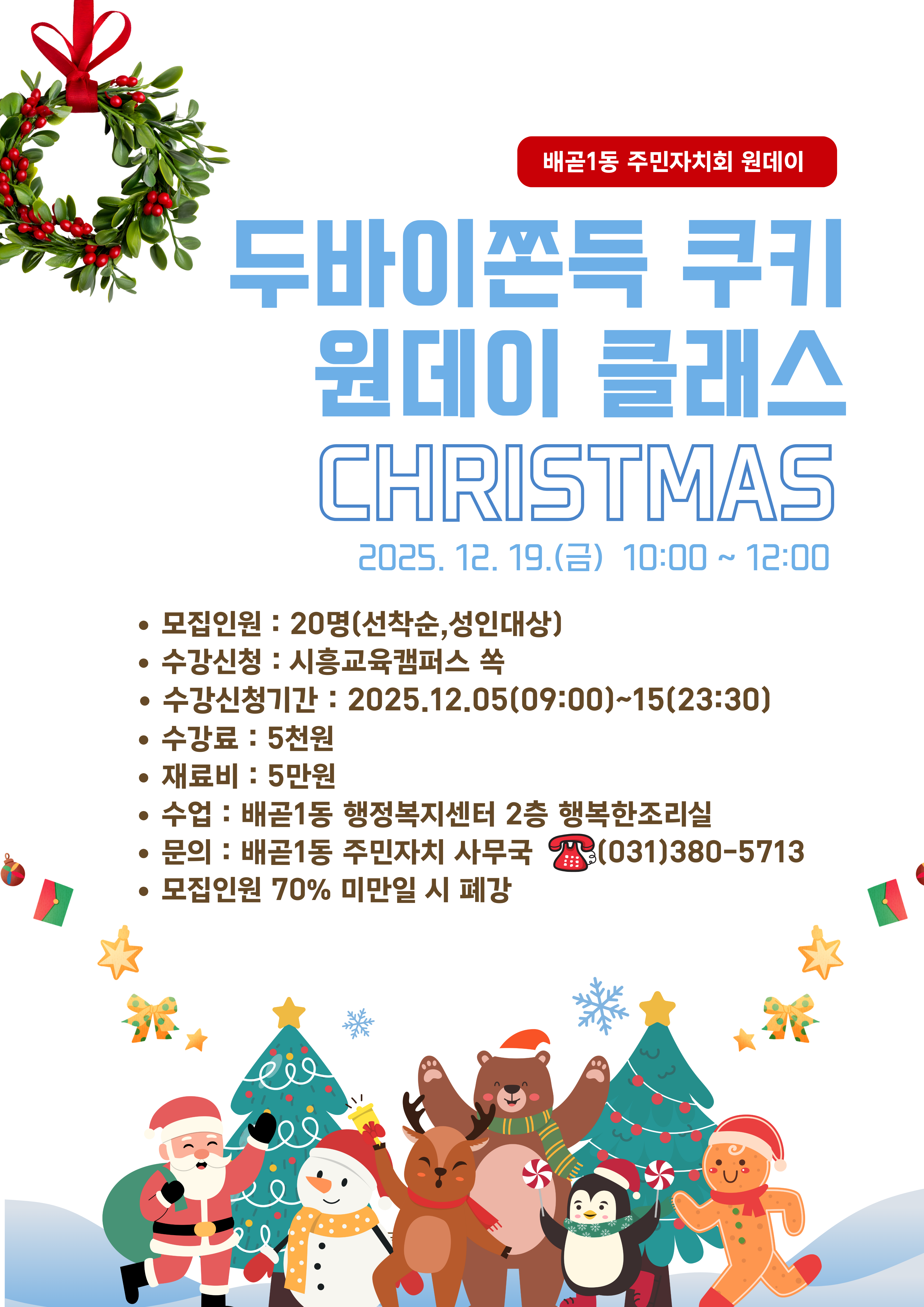 배곧1동 주민자치회에서 크리스마스를 맞이하여 '베이킹 원데이' 를 개설합니다. <홈베이킹 원데이 클래스 안내 — 쫀득쿠키 8개 만들기> 겉은 바삭, 속은 말랑한 핸드메이드 쫀득쿠키 위에 카다이프 토핑과 피스타치오 100% 스프레드를 더해 풍미를 극대화한 프리미엄 쿠키를 완성합니다. 모든 과정은 강사님의 시그니처 레시피로 특별 제작되며 어디서나 쉽게 따라 할 수 있는 홈베이킹 비법도 함께 알려드립니다. 📌 클래스 정보 -일시: 12월 19일(금) 오전 10:00 ~ 12:00 -메뉴: 쫀득쿠키 8개 -정원: 20명 -재료비: 50,000원(강사님께 직접) -수강료: 5,000원