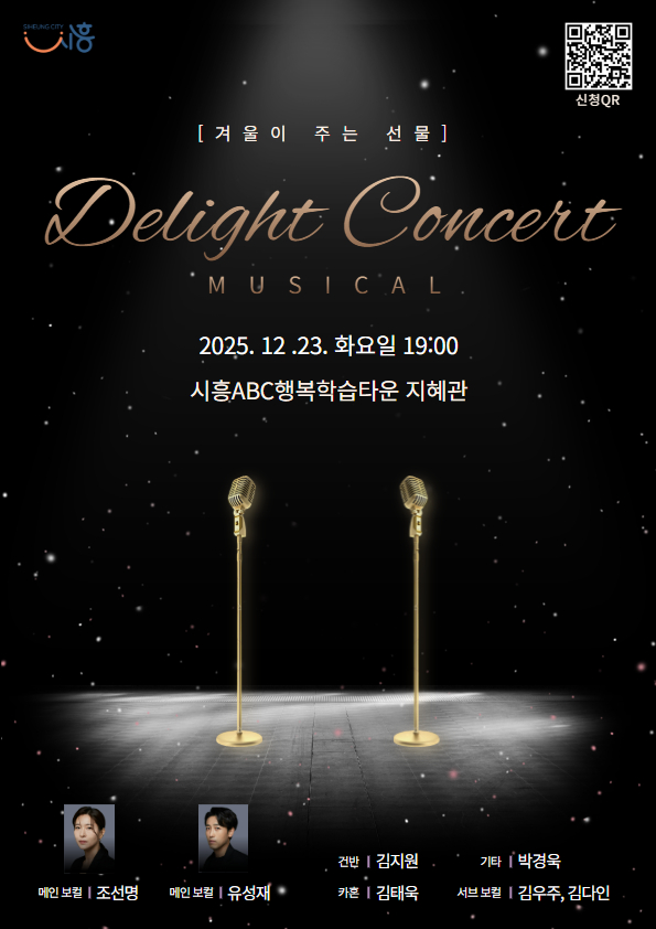 [지혜관의 크리스마스 특별 공연] 추운 겨울, 문화 공간인 지혜관에서 시민들과 함께하는 따듯한 시간을 준비하였습니다. 일시 : 2025. 12. 23. (화) 19:00~ 장소 : 시흥ABC행복학습타운 지혜관 2층 출연 : 조선명 · 유성재(메인 보컬), 김지원(건반), 김태욱(카혼), 박경욱(기타), 김우주 · 김다인(서브 보컬) * 안내 사항 2025년을 마무리하며 나와 가족, 친구 등에게 전하는 메시지와 사진을 남겨주세요! (공연 중 화면으로 송출될 예정입니다.)