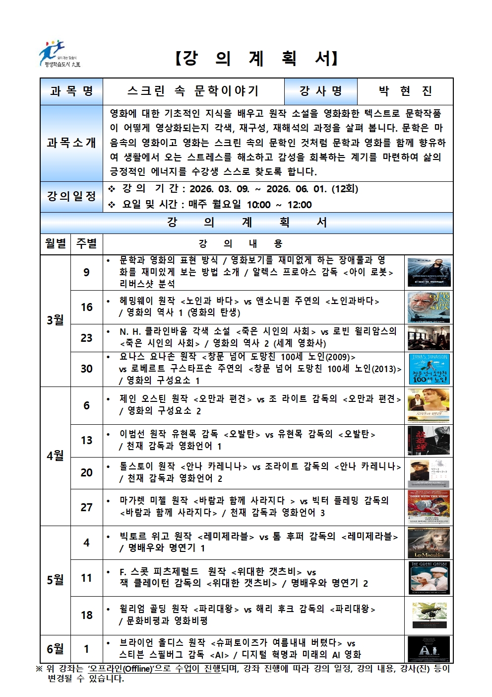 [구리시평생학습관] [구리시평생학습관]2026년 상반기 정규강좌 05. (신규)스크린 속 문학 이야기프로그램 별 일정 및 강의 계획서 사전 확인 필수!