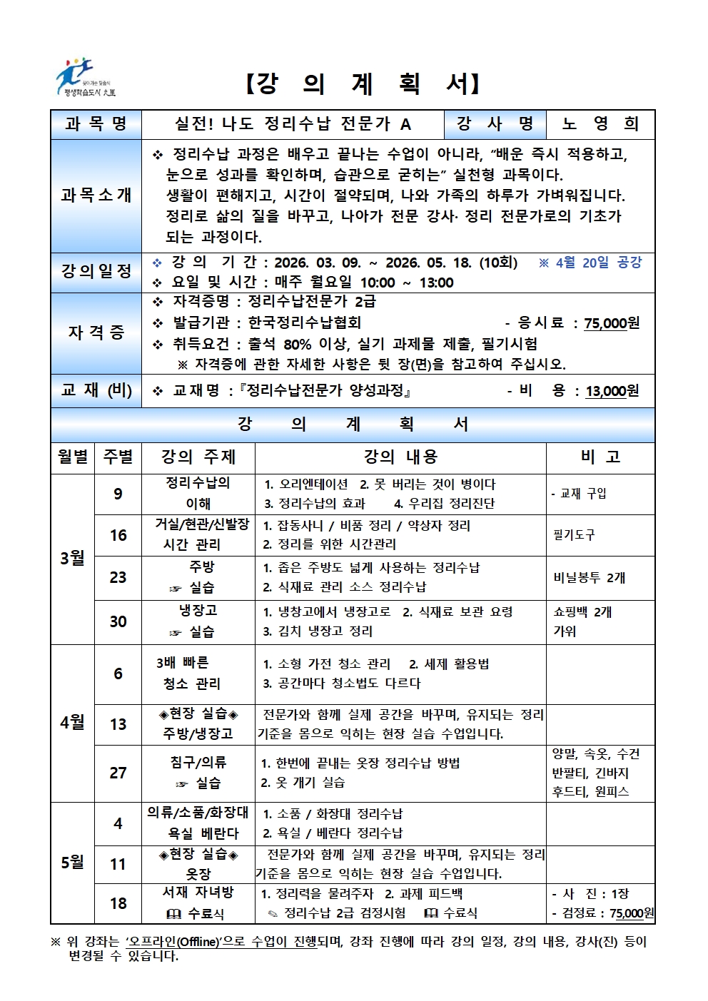 [구리시평생학습관] [구리시평생학습관]2026년 상반기 정규강좌 03. (신규)실전! 나도 정리수납 전문가 A프로그램 별 일정 및 강의 계획서 사전 확인 필수!