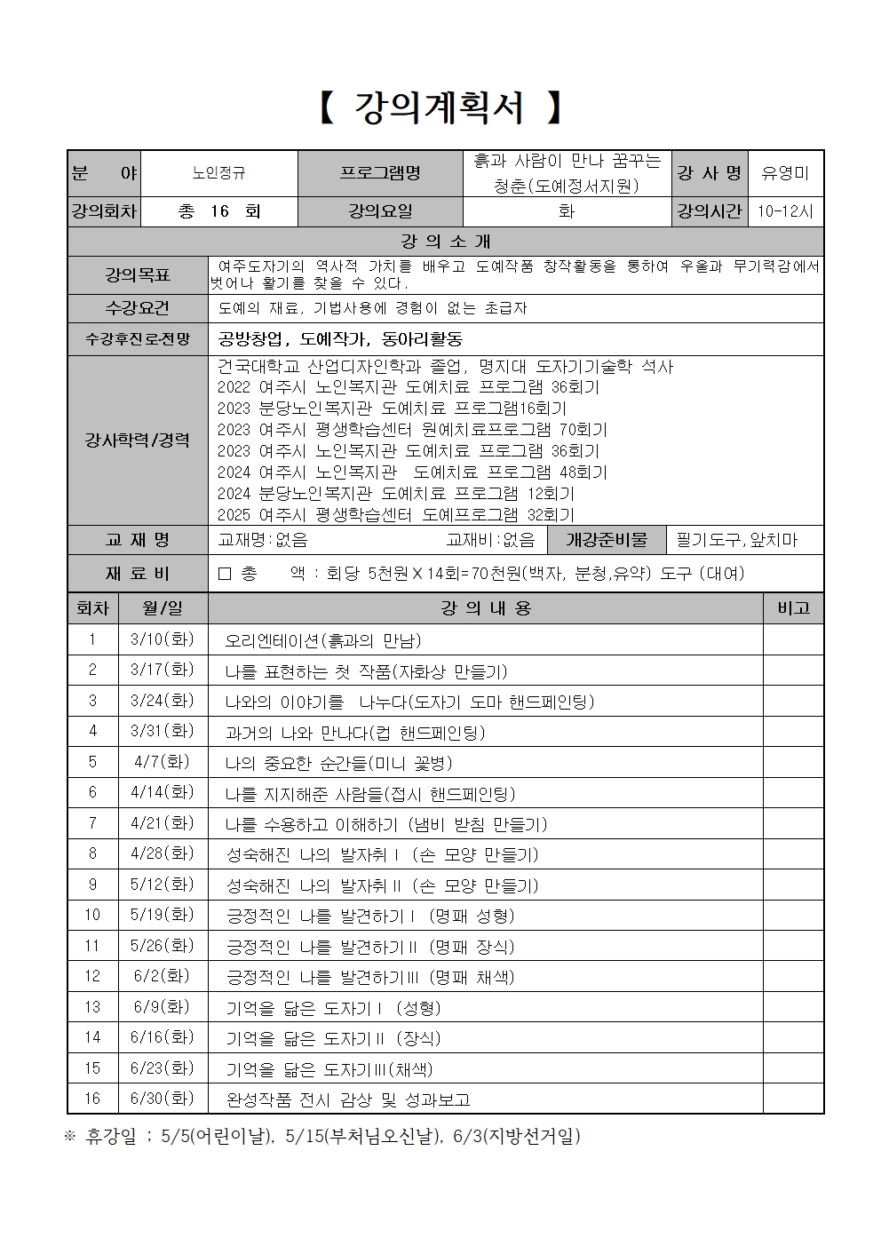 노인프로그램 2026년 상반기 노인프로그램 흙과 사람이 만나 꿈꾸는 청춘(도예정서지원)