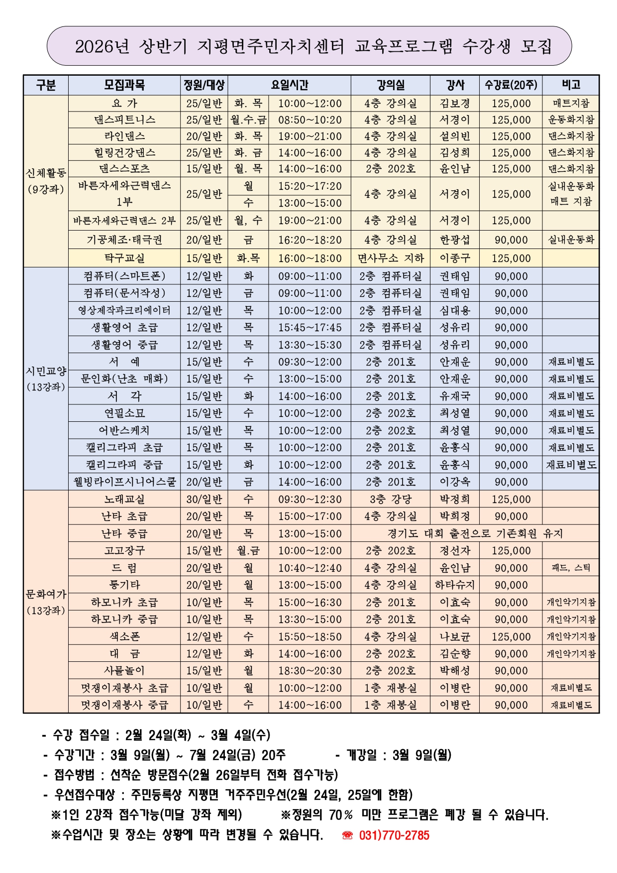 ◆ 2026년 지평면 주민자치센터 상반기 수강생 모집 ◆ - 접수기간: 2026. 2. 24.(화) ~ 3. 4.(수) - 교육기간: 2026. 3. 9.(월) ~ 7. 24.(금) - 교육장소: 지평면 주민자치센터 ※ 기타문의사항은 지평면 주민자치센터(031-770-2785)로 연락주시기 바랍니다.