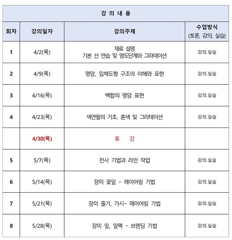 4. 재료비 및 교재비는 강사님께 직접 개별 납부하며 추후 변동 될 수 있습니다.