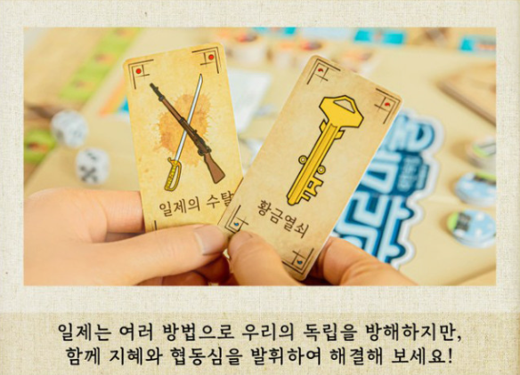 "대한독립 보드게임" 은 국가보훈처와 부루마불에서 제작한 교육용 보드게임으로 민족의 생생한 운립운동 현장에 적극적으로 참여하며 개개인의 지혜와 구성원 간의 친밀한 협력을 통해 독립운동의 거점을 마련하고 발전시켜 각 독립운동의 완성을 실현함으로써 궁극적인 대한민국의 독립을 이룩하는 게임입니다. - 소요시간: 120분 - 참여인원: 4명 이상 가능 - 참여연령: 초등학생 이상