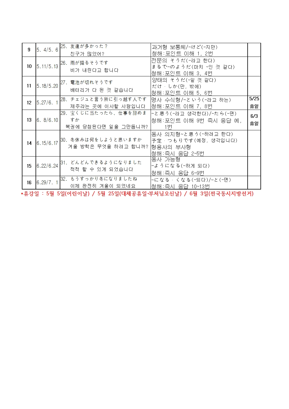 일본어 회화 초급은 동사의 ます형, て형 활용을 할 수 있는 분들을 대상으로 하며, ZOOM을 이용한 실시간 화상수업으로 진행합니다. 이번 과정에서는 동사의 て형, た형, ない형, 형용사의 과거형, 전문과 추측, 의지형, 가능 동사 등 초급 레벨의 문법과 문형을 공부합니다.